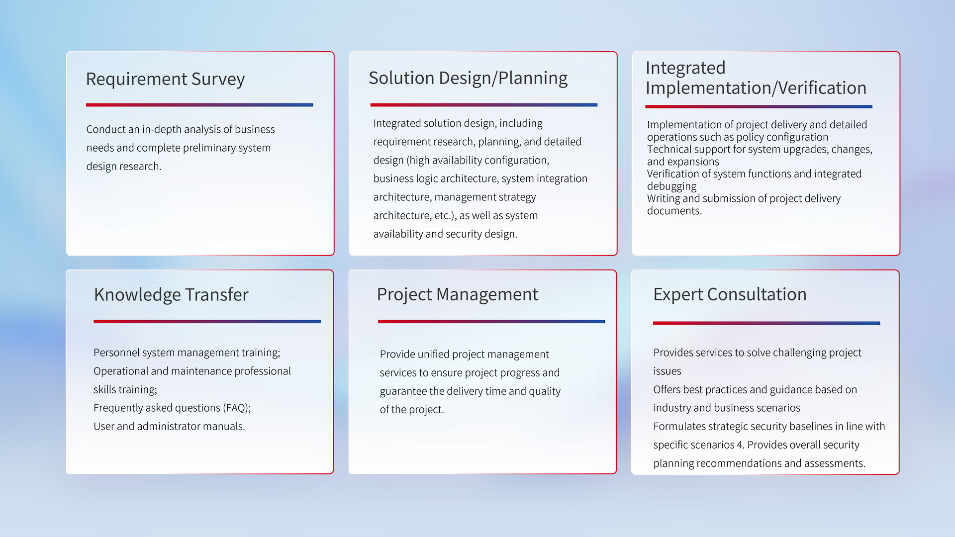 According to the customer's industry characteristics, the macro security strategy and needs are realized through professional delivery services, providing customers with standardized and integrated delivery services.