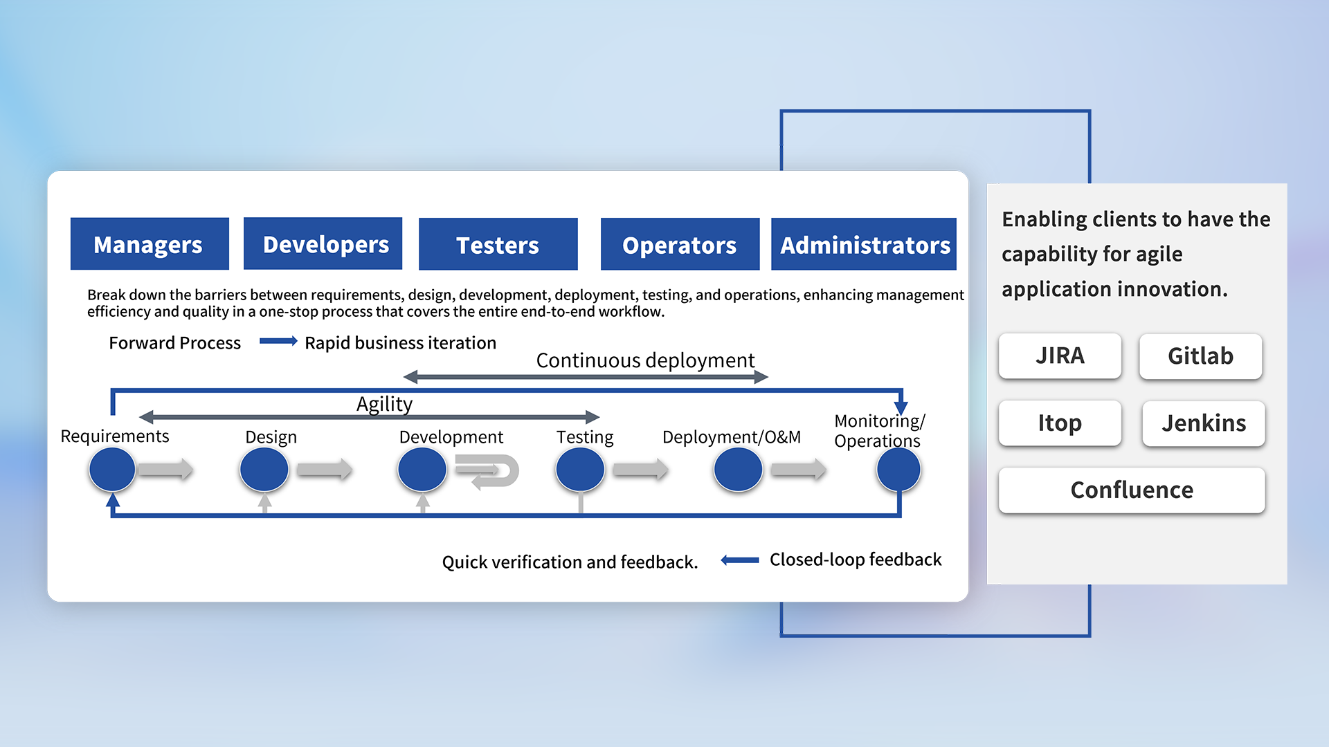 Provide customers with installation and deployment of open source software such as JIRA, Confluence, Itop, Jenkins, Gitlab, etc., break down barriers between requirements, design, development, deployment, testing, and operations, and improve management efficiency and quality in one stop. Build a unified application development platform and an agile development system throughout the end-to-end process, enabling customers to have agile application innovation capabilities.